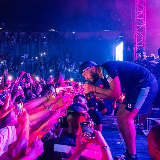 Sur scène, il donne tout pour ses fans — il chante avec eux, il vit le moment avec eux.